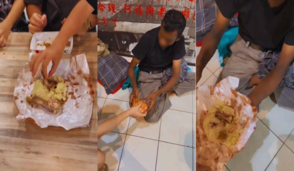 Tangkap layar video tularyang memaparkan sekumpulan individu dipercayai pempengaruh memberi sisa makanan kepada seorang gelandangan